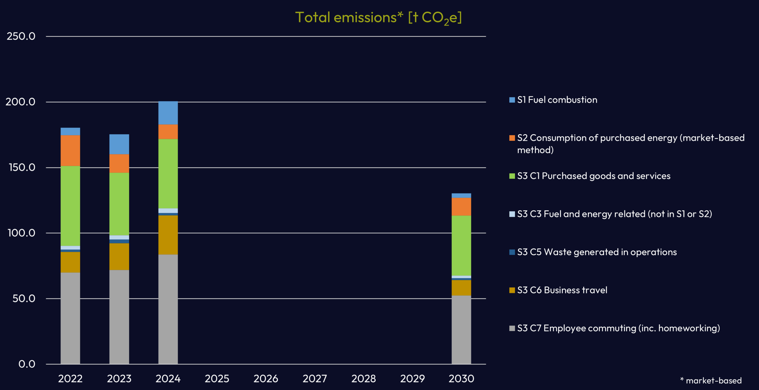 Our total emissions for our base year were 180.3 tCo2e, and our total emissions for 2023, which is the latest year for which we have full data available, were 175.5 tCO2e, which represents a modest reduction in emissions against a backdrop of growing employee numbers.