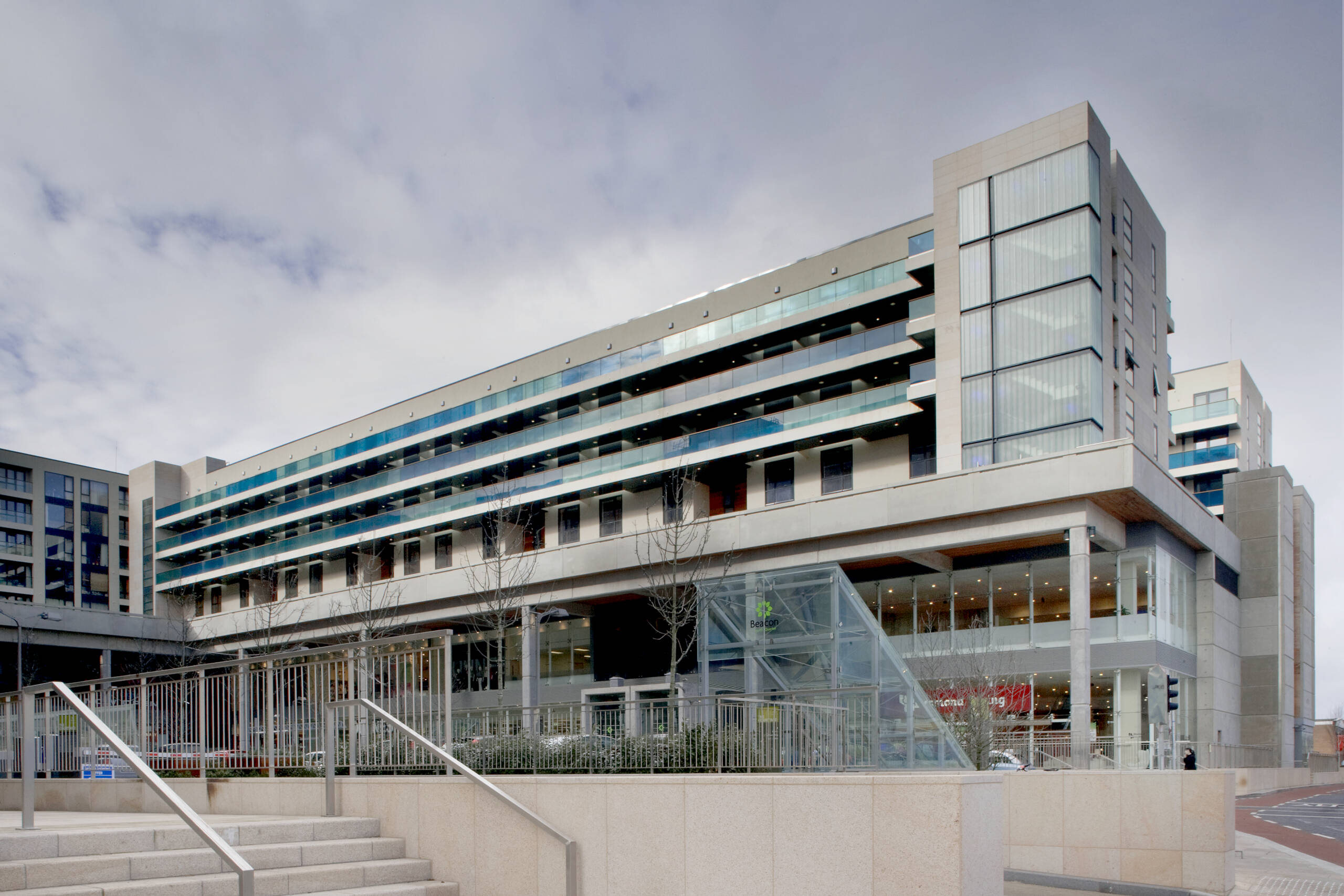 Beacon South Quarter is a mixed residential and retail development on a 5.2 hectare brown field site in Sandyford. PUNCH worked on the project from inception in 2004 to include master planning, statutory approvals, tender and construction. Such was the scale of the project, that our initial client Landmark Developments employed three main contractors all working on the site simultaneously, namely John Paul Construction, PJ Hegarty and Laing O’Rourke i.e. two of Irelands largest contractors and one of the largest contractors in the world. At one point there were almost twenty tower cranes on the site and almost 1,500 operatives. With over 23,000m2 of upmarket retail outlets, 7,700mof office space, 2,300 car spaces and 1,100 luxurious apartments, Beacon South Quarter represented a major phase of redevelopment of Sandyford Industrial Estate in South County Dublin.