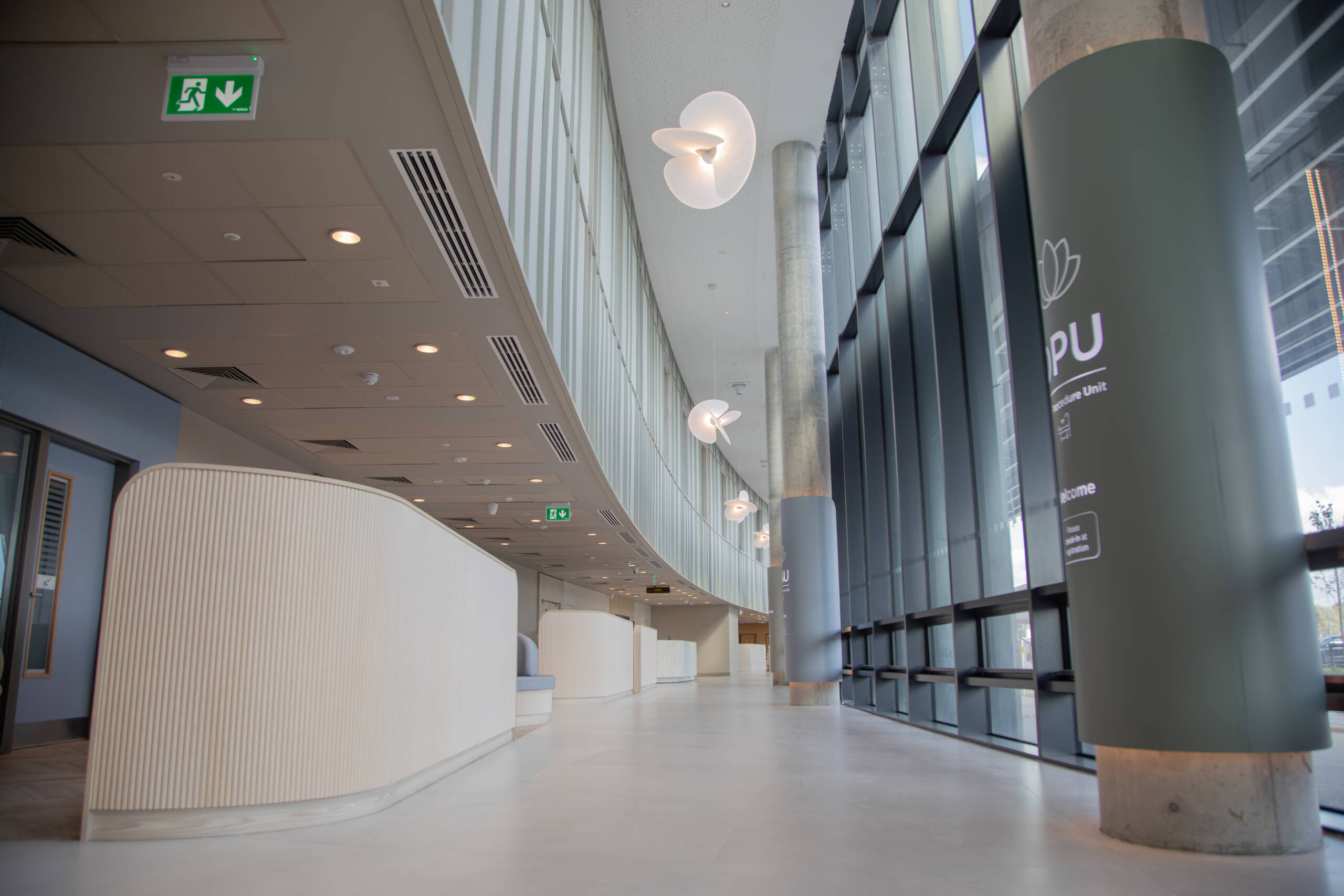 Site access requirements saw upgrades to entrances given the proximity of the hospital to an adjacent school. A dedicated entrance pick up point was provided for the collection of patients from the Discharge Lounge, as well as a single ambulance entrance point close to the Main Entrance of the new Hospital. Other Masterplan developments were considered in the design of the hospital’s location and access.