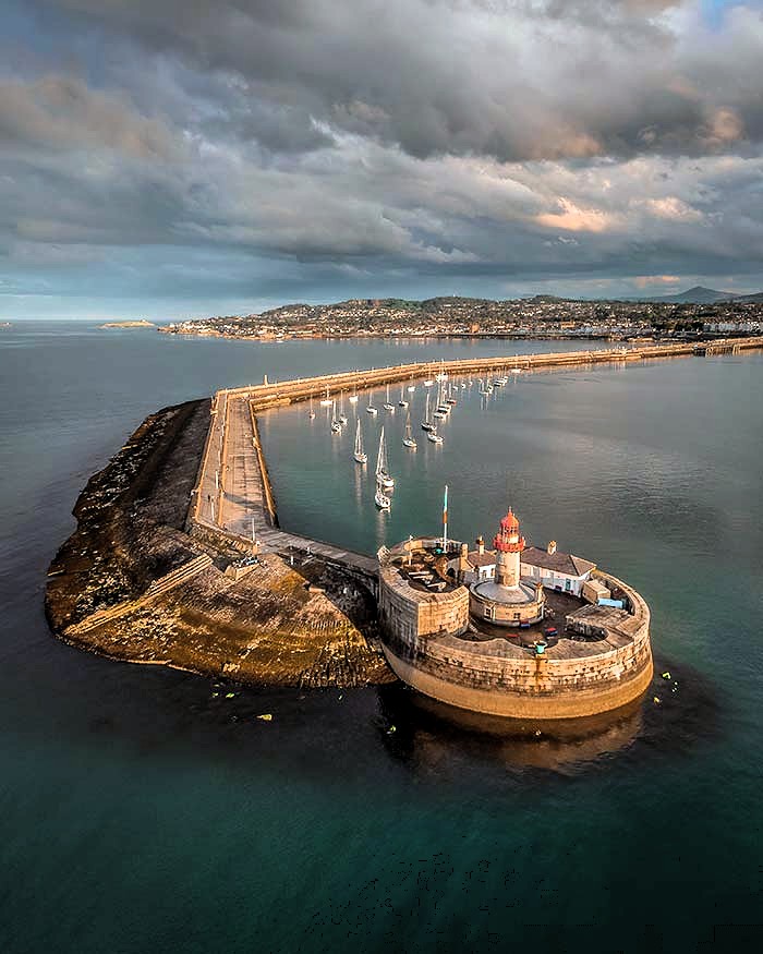 The East Pier spans approximately 1.6km, and features an inner sea wall, dual pedestrian access levels, an upper wall on the East side of the walkways, and a sloping revetment leading into the waters of Dublin Bay. The pier culminates in a roundhead that includes a lighthouse within a historic Battery complex.