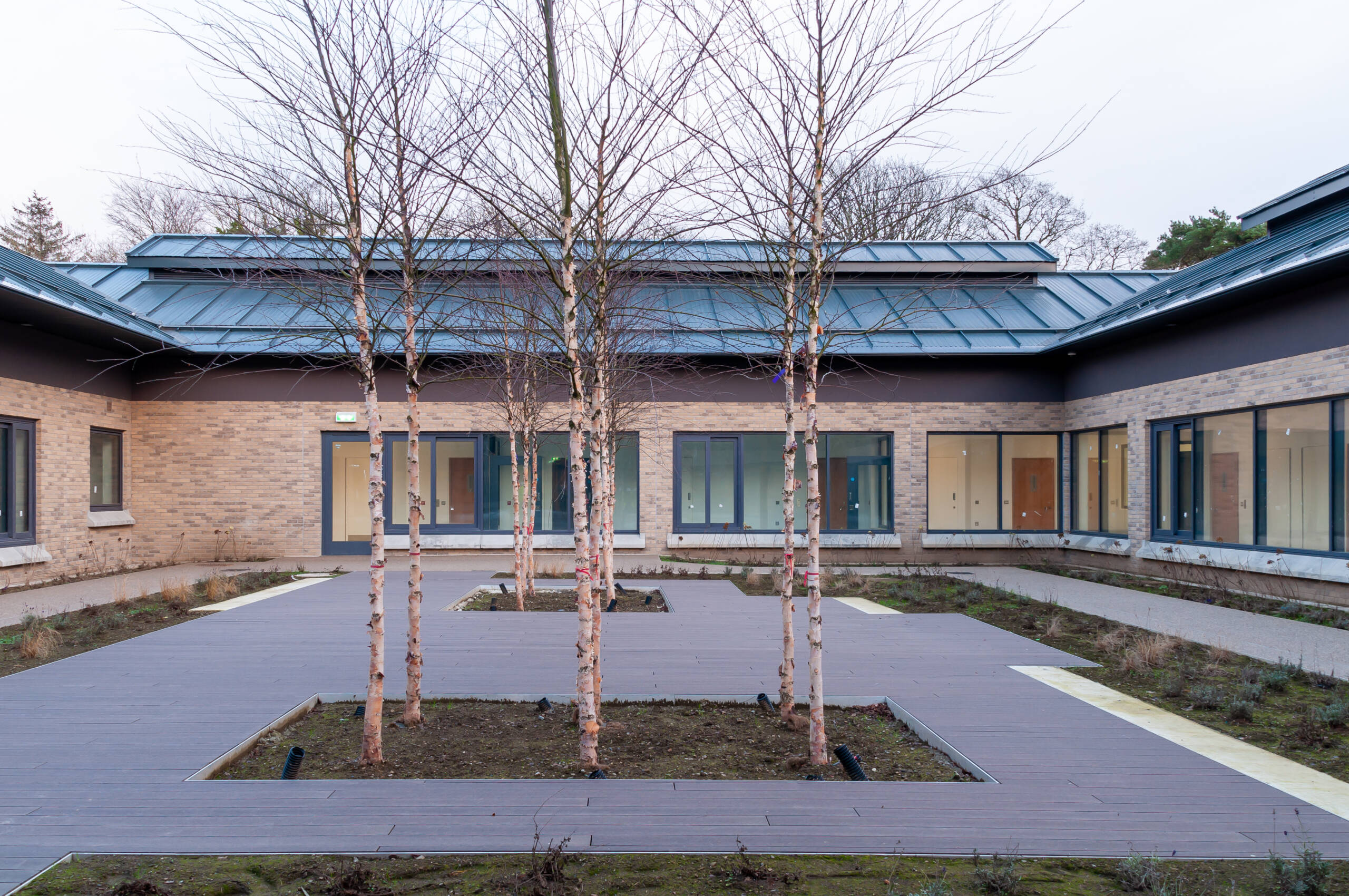 The buildings are arranged around a central landscaped area that interlinks them. Designed with internal secure landscaped courtyards, they allow natural light to permeate, creating safe and pleasant spaces for patients. An internal access road runs behind each building. Except for the Intensive Care Rehabilitation Unit and the Child and Adolescent Mental Health building, all other structures are surrounded by a 5.2m high security fence.
